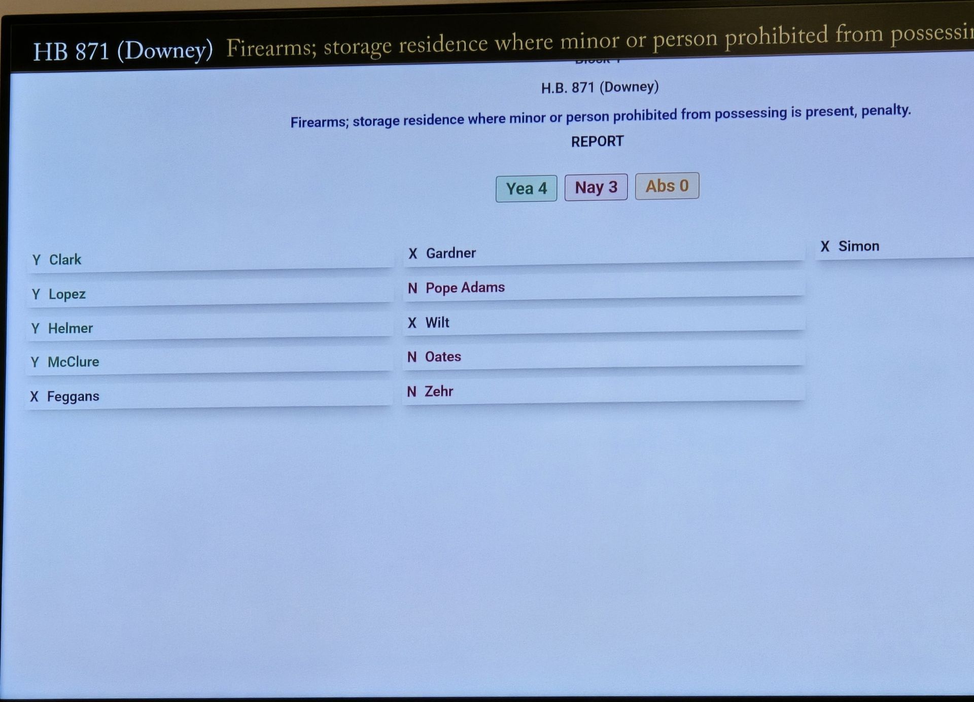 The reconsideration vote was 4 to 3, with Delegate Pope Adams voting against the bill just as she had done earlier.