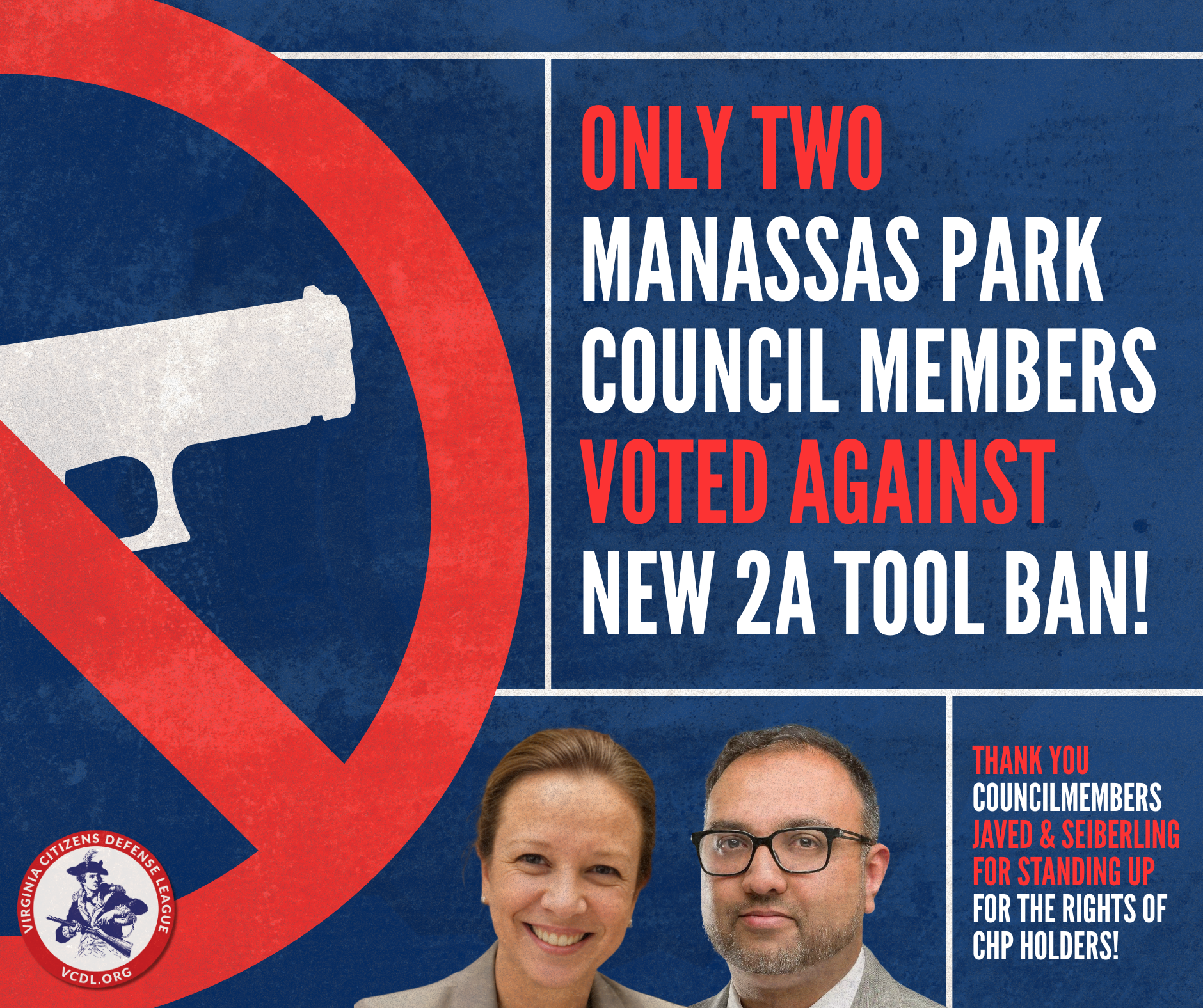 Manassas Park has adopted an ordinance banning the carry of guns in their government buildings, with no exception for CHP holders. It passed 5 to 2, with both Council members Javed and Seiberling voting NO because there was not a CHP exemption. VCDL thanks Council members Javed and Seiberling for standing up for all the CHP holders in Virginia. The Vice Mayor was the driving force on this bad ordinance.