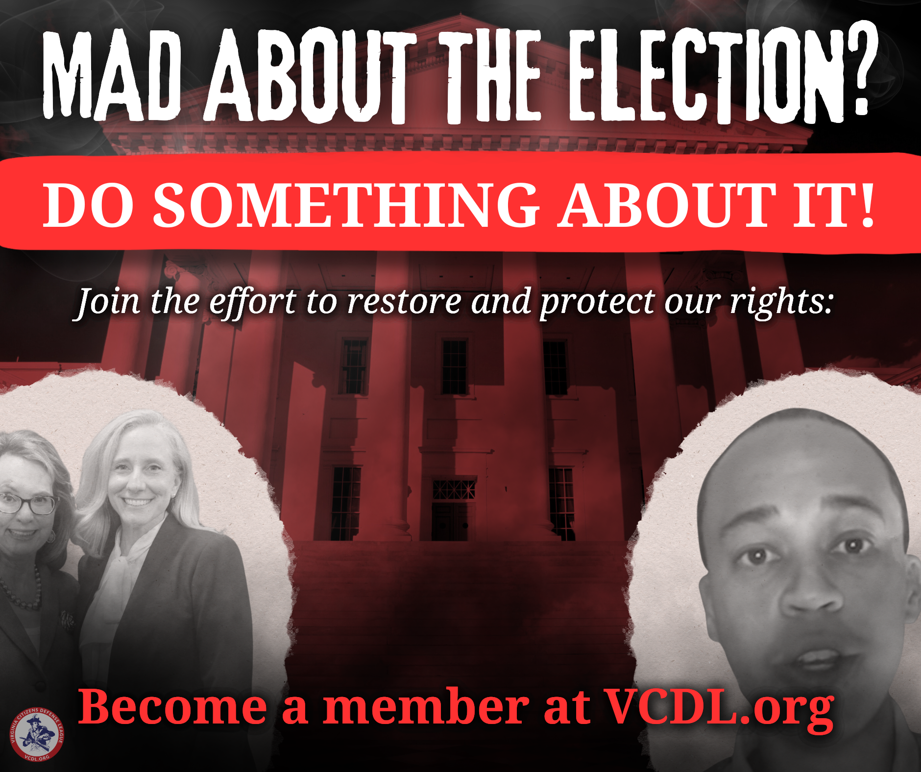 As VCDL warned in alerts before the election – if the election goes wrong, we could be back in 2019-2021 all over again. Gun controllers controlling the Governor’s office, the House, and the Senate. Gun controllers also controlling the Lt. Governor’s office and the Attorney General’s office.
